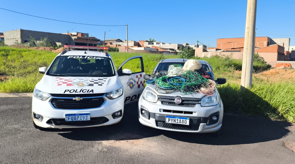 A mulher foi presa em flagrante por furto. A polícia fez buscas, mas o homem não foi detido. O material e o veículo foram apreendidos.